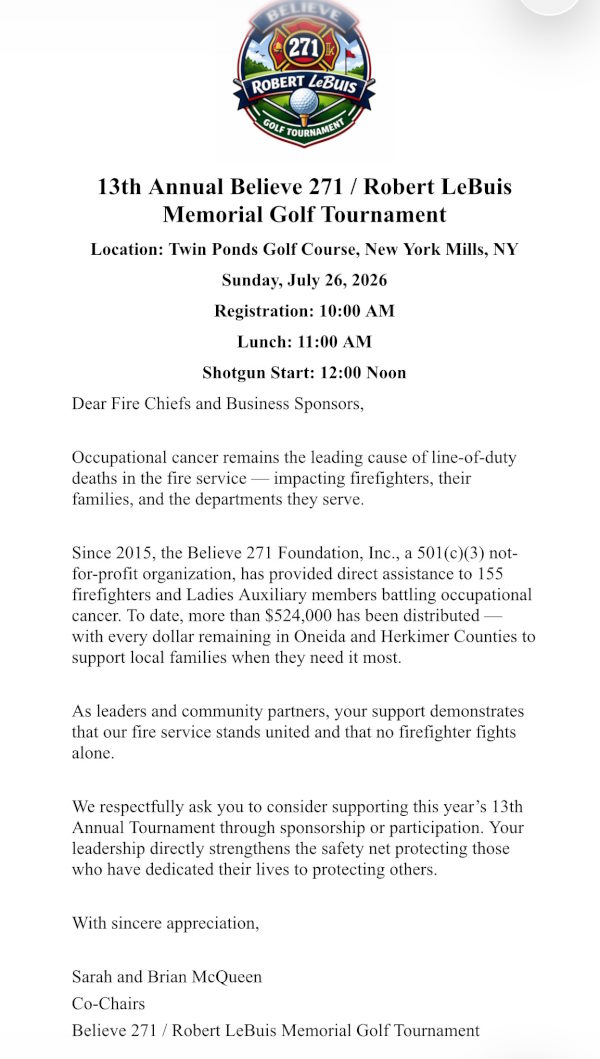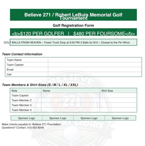 13th Annual Believe 271 / Robert L. LeBuis Memorial Golf Tournament Twin Ponds Golf & Country Club 169 Main St, New York Mills, NY 13417 Sunday, July 26, 2026 Registration: 10:00 am Lunch: 11:00 am Tee Off: 12:00 pm $120 per golfer $480 per team Buffet Dinner to Follow Golf This year we are limiting it to 144 golfers and as always sponsorships and silent auction items are encouraged. 2026 Golf Letter (Click to Download) 2026 Golf Registration Form (Click to Download) 2026 Golf Sponsorship Form (Click to Download)