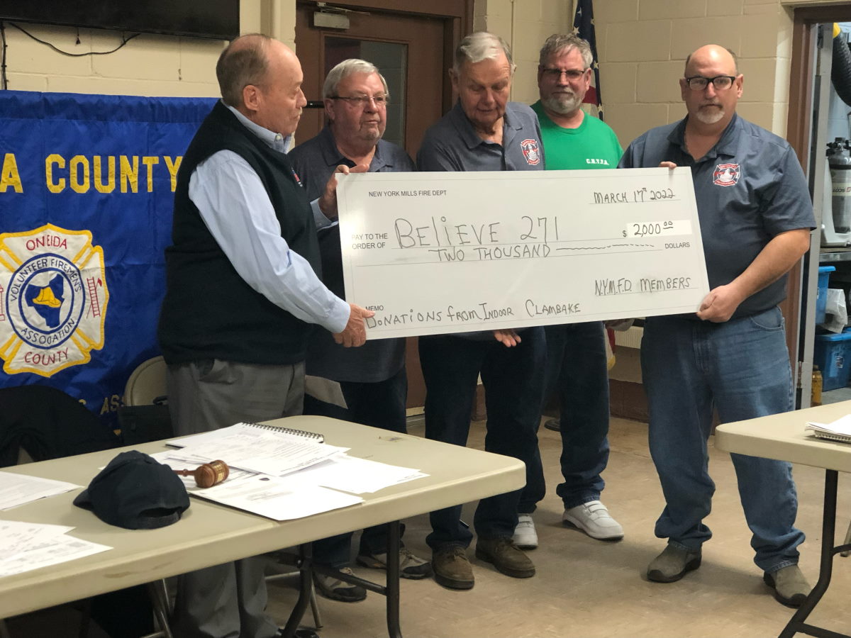 Thank you New York Mills FD for your $2,000 donation from your Indoor Clambake.