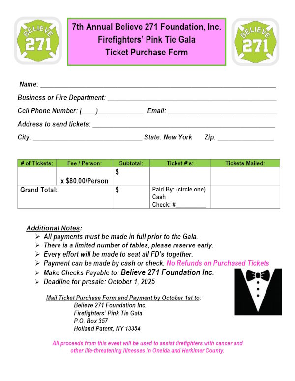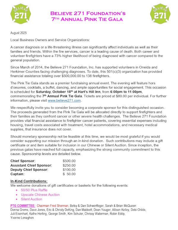 Since March of 2014, the Believe 271 Foundation, Inc. has supported volunteers in Oneida and Herkimer Counties facing challenging diagnoses. To date, this 501(c)(3) organization has provided financial assistance totaling over $500,000.00 to 138 firefighters.