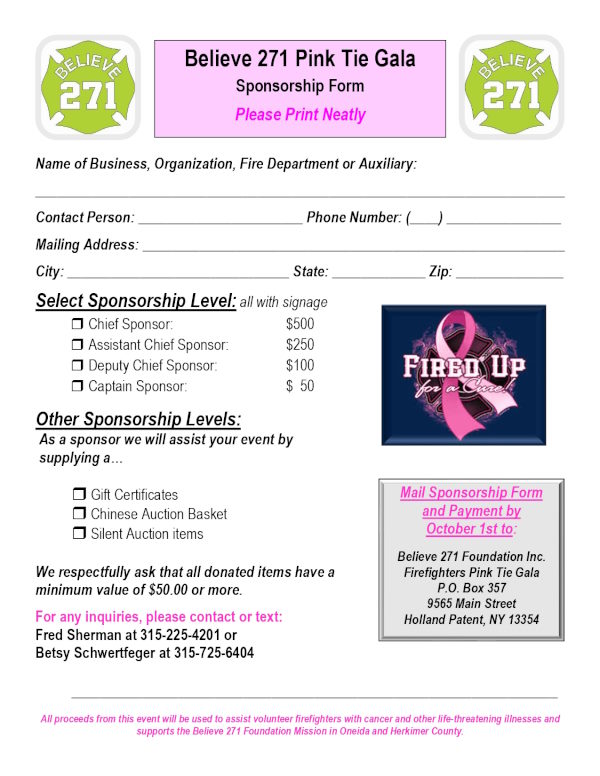 We respectfully invite you to consider becoming a corporate sponsor for this distinguished occasion. The proceeds generated from the Pink Tie Gala will be allocated directly to support firefighters and their families as they confront cancer or other severe health challenges. The Believe 271 Foundation provides vital financial assistance to firefighter cancer patients, covering essential expenses including housing, travel costs associated with treatment, hotel accommodations, and necessary medical supplies, that insurance does not cover.